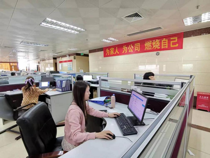 在總部,在“為家人,為公司,燃燒自己”的醒目標(biāo)語下,工作人員各司其職,伏案工作。